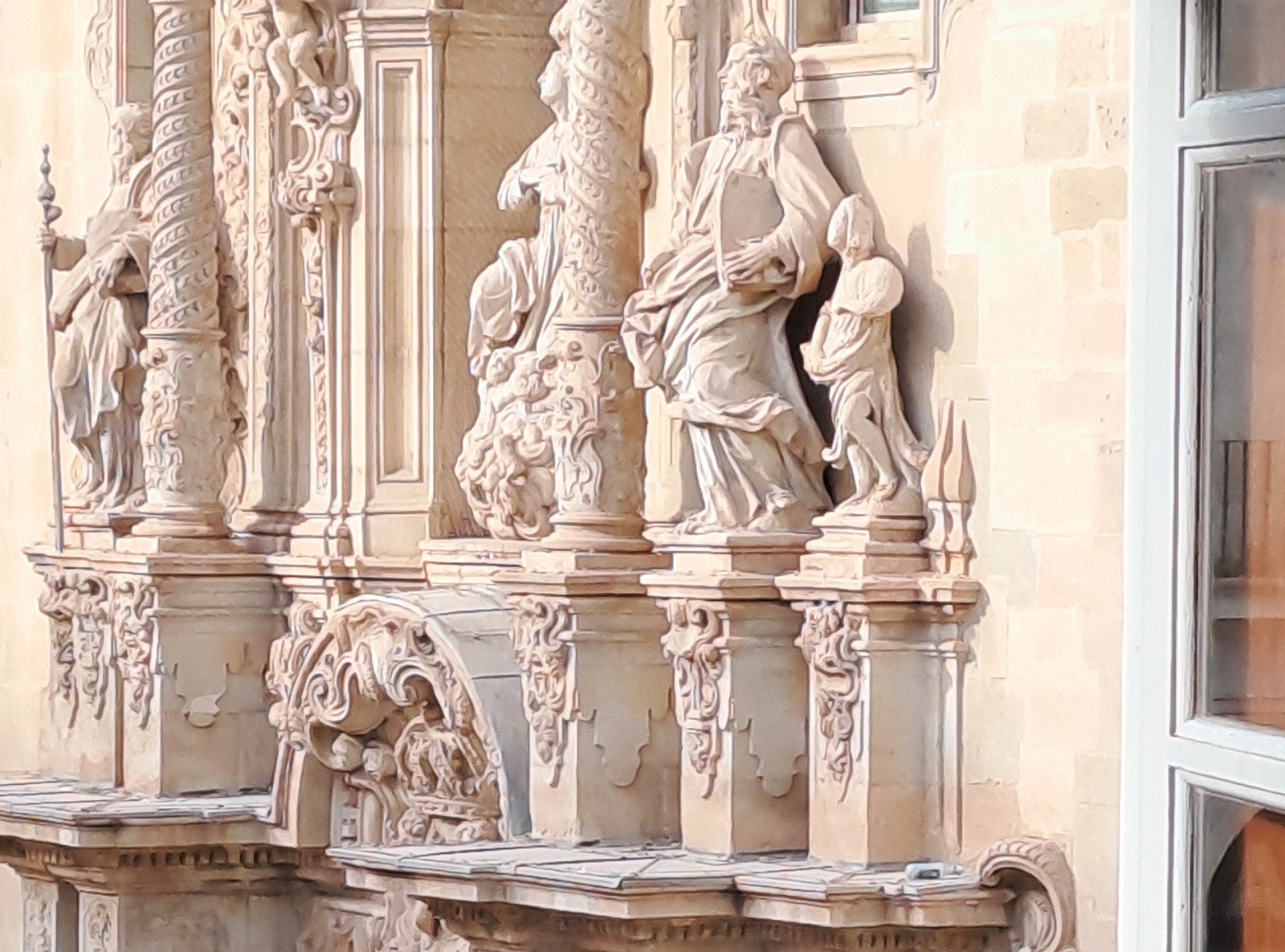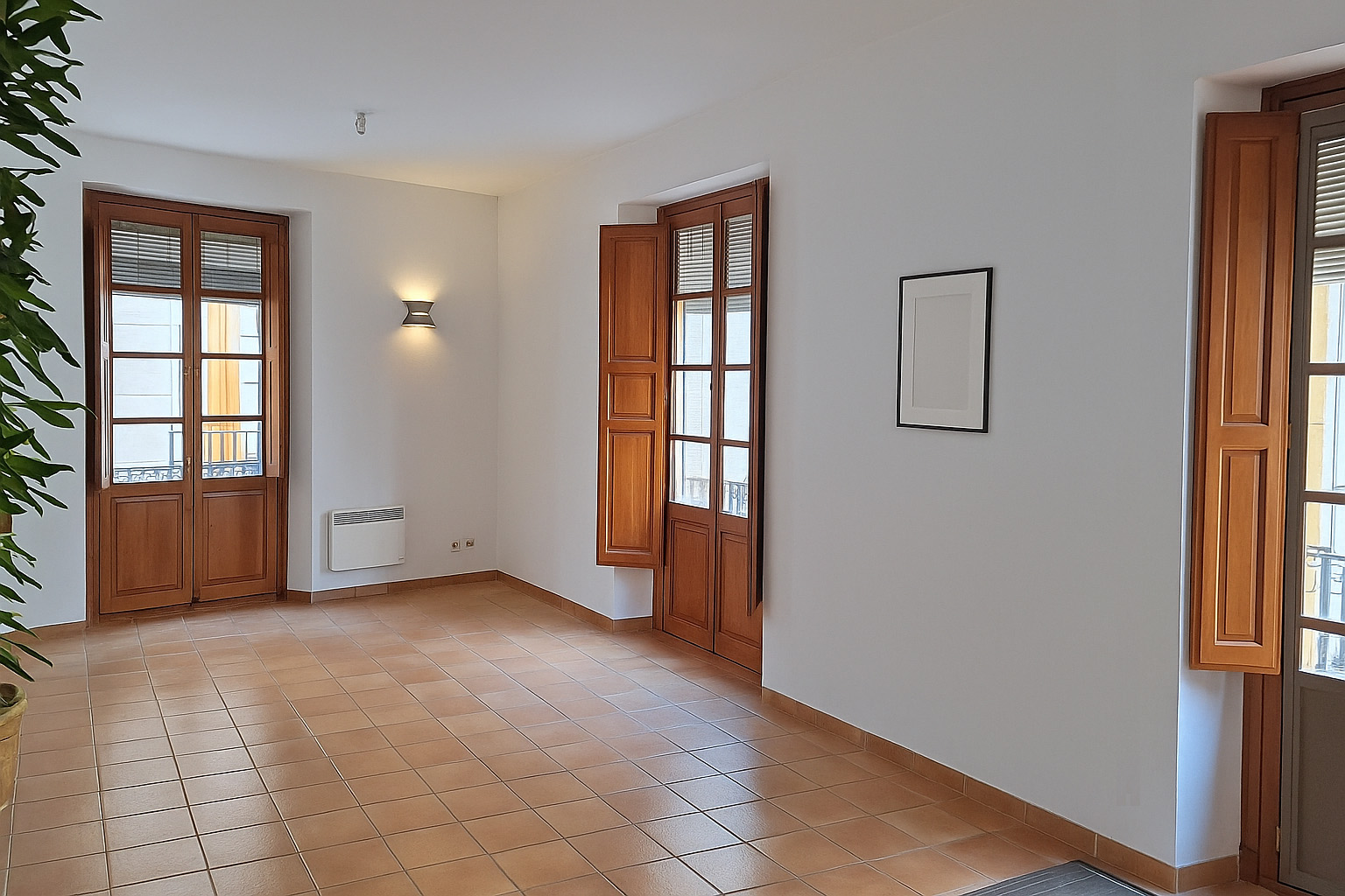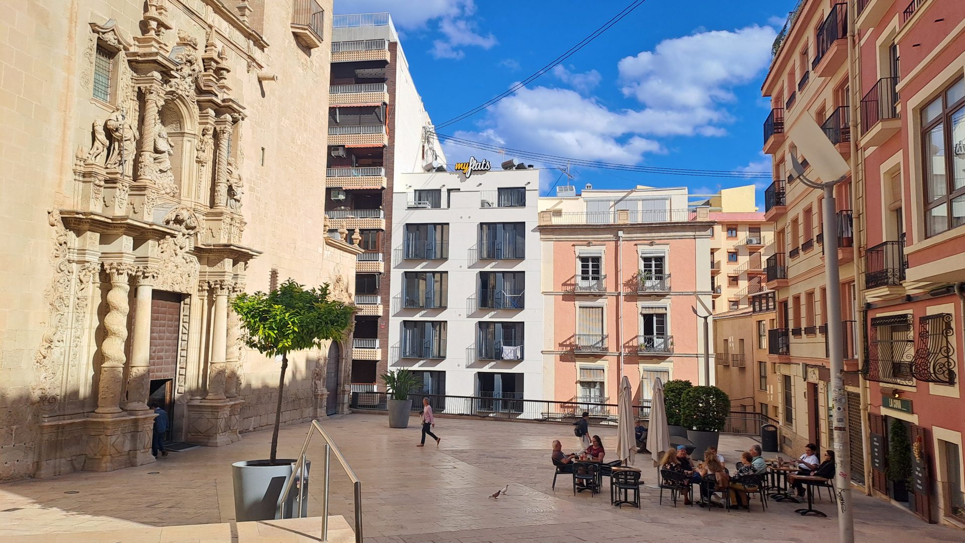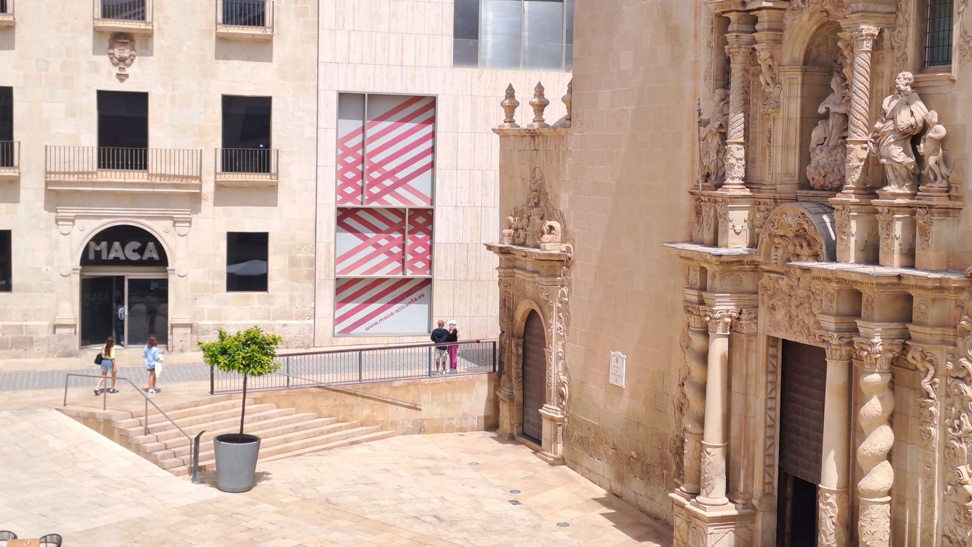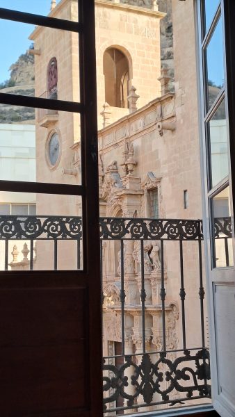 Desde el balcón, una iglesia gótica del siglo XIV con fachada barroca del XVIII y un museo de arte contemporáneo se reparten la plaza. Lo clásico y lo moderno dialogan frente a la vivienda, reflejando el equilibrio en el que se asienta: tradición y vida actual, monumentalidad y funcionalidad.